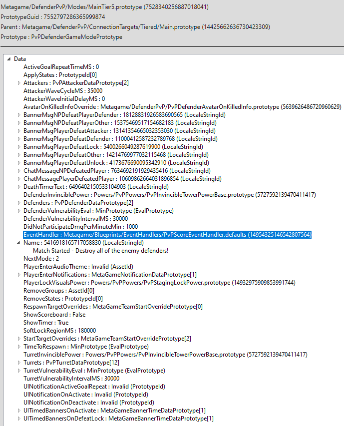 This mode is controlled by a class called PvPDefenderGameMode with its data defined in PvPDefenderGameModePrototype: